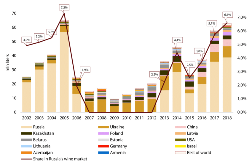 Wine Export of Georgia volumeIn 2023, Georgia exported $262M of Wine, making it the 14th largest exporter of Wine (out of 188) in the world. During the same year, Wine were the 4th most exported product (out of 991) in Georgia. In 2023, the main destinations of Georgia's Wine exports were: Russia ($168M), Poland ($15.5M), Ukraine ($15.2M), China ($11.7M), and Kazakhstan ($9.41M).
